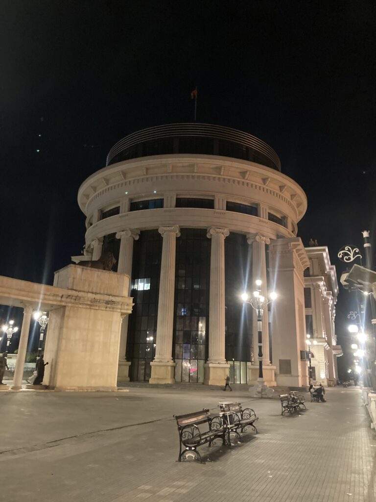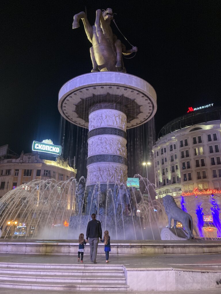 Návštěvu hlavního města Severní Makedonie jsme neměli vůbec v plánu. Ale k večeru jsme přejeli celkem svižně srbsko-makedonské hranice, na spací spot to byla sotva hodinka cesty a tak jsem jen tak plácla, že můžeme do města. Kuba bleskově našel parkoviště v centru (kryté pod budovou opery, při parkování jsme se lehce rosili, zda se vejdeme a vešli jsme se akorát) a pak jsme nazdařbůh vyrazili do města.