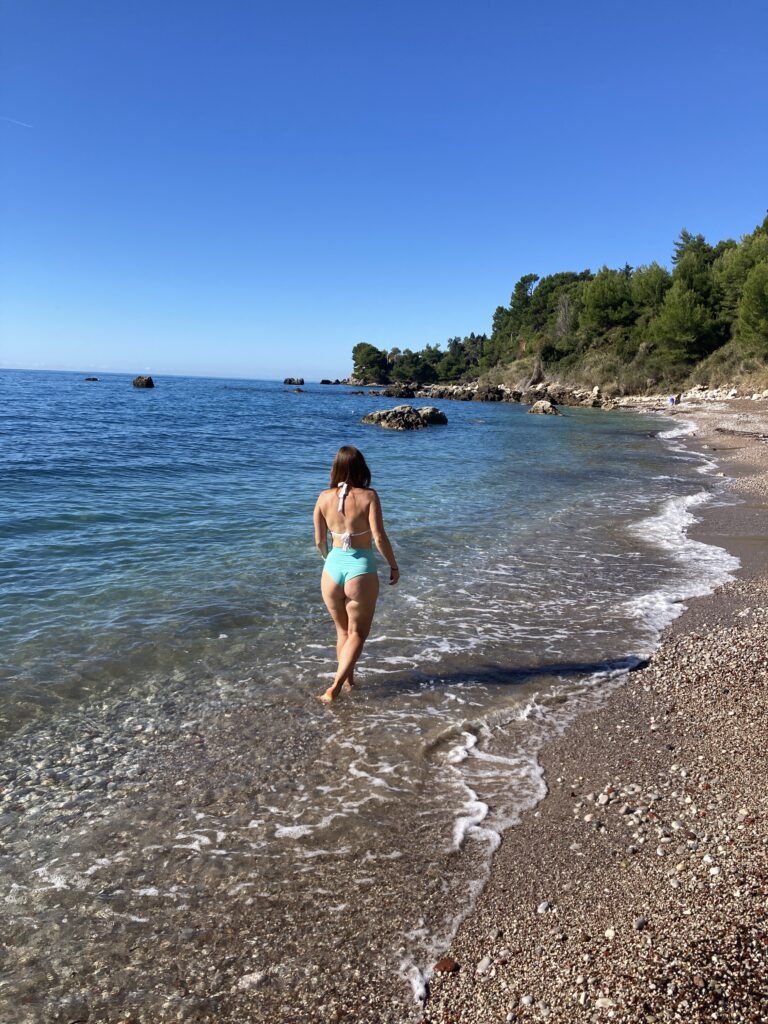 Voda je tu průzračná, tyrkysová. Ale… Zažili jsme tu jediné dva vydatně deštivé dny na cestě 😀 Jeli jsme na jih za největším teplem a sluncem a nakonec jsme tu zažili pořádnou bouřku i vydatný déšť. Nicméně koupačka byla nakonec taky a byla skvělá. I zmrzku na pláži jsme si dali, sice v dešti a v softshellkách, ale dali 😀 A pak jsme usoudili, že se radši vrátíme zpátky do Spille.