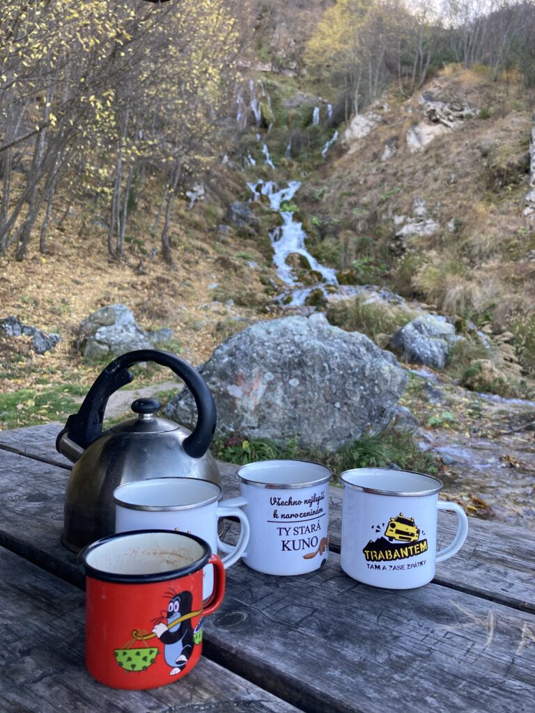 Tohle bylo místo, který nám ráno po probuzení vyrazilo dech. Našli jsme ho v Park4night (ostatně jako všechna místa) a absolvovali jsme noční výjezd úzkou horskou silnicí. Na místě jsme se vůbec nemohli zorientovat a najít avizovaná místa na stání, takže Kuba nakonec zvolil takovou slepou cestu, kam zuřivě couval. V jednu chvíli najel na drn, Busíkovi jedno kolo trčelo do vzduchu, celý se kymácel a já už ho viděla dole v údolí. Ale Kuba je prostě dobrý řidič (no však ho to živí) a se vším se popasoval skvěle. Vodopády jsme nikde neviděli, tak jsme to nechali na ráno.
